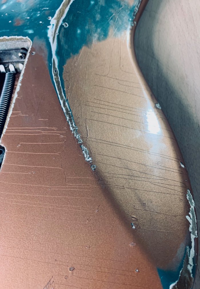 - 100% nitrocellulose METALLIC COPPER OVER METALLIC SHERWOOD GREEN finish and professionally aged by MJT® Aged Finishes in Missouri, USA with an Extreme-Aging (superb “checking marks” on the whole body), see photos.