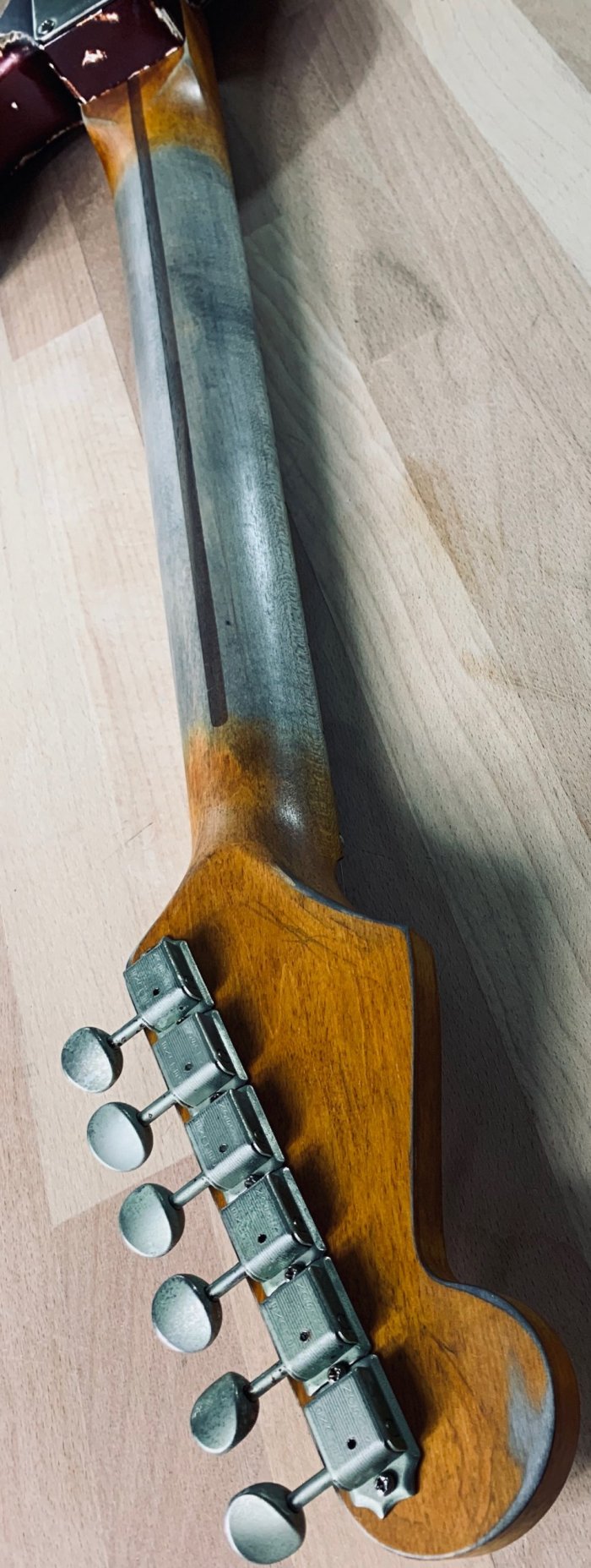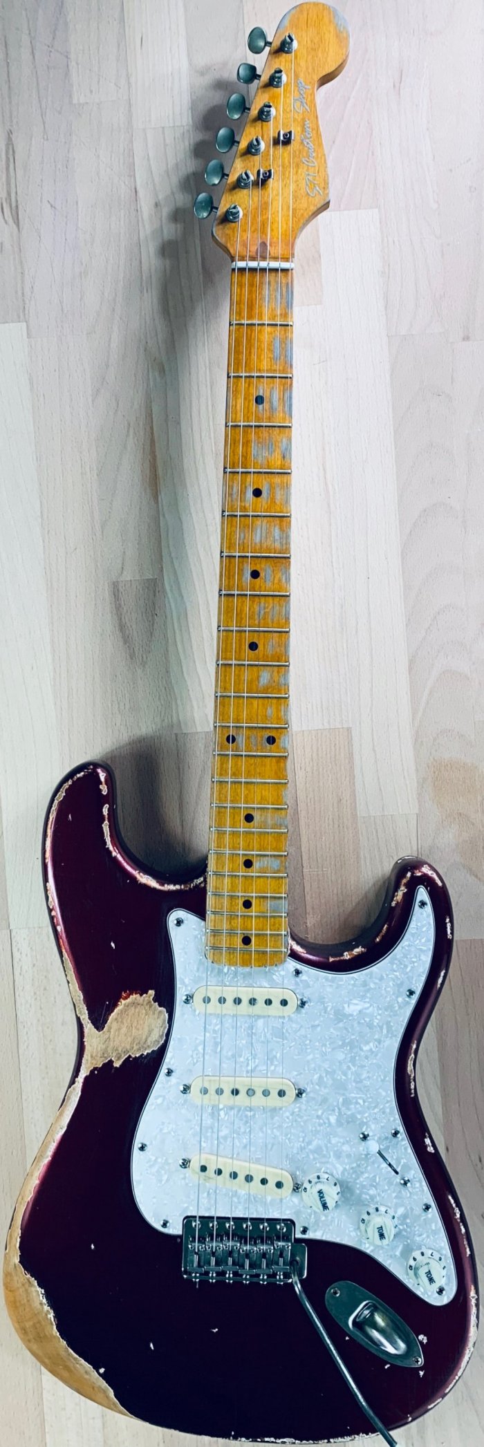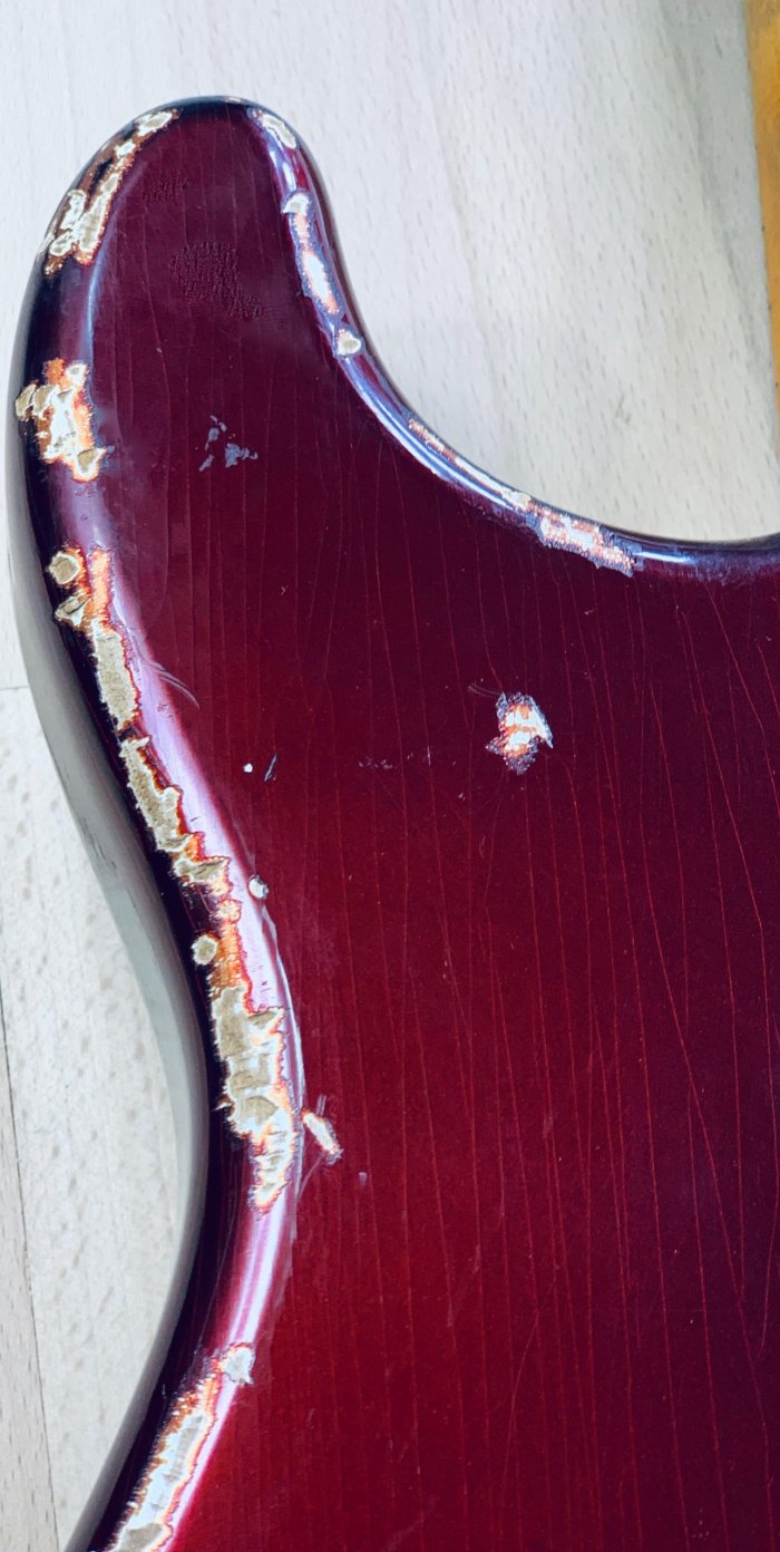 Selected Alder Strat body made by Wildwood® Manufacturing in California USA, MJT® USA Nitrocellulose Candy Red Apple finish with a Heavy-Relic and checking marks all over the body done by MJT® and S71 Guitars. High-end AllParts® USA maple neck « C » profile perfectly aged in Amber full-nitro by S71 Guitars. Handwound Pickups « Traditional Vintage”. Handwired electronics with Vintage specs, Pio capacitor and « 6-Sounds Stratocaster ». Kluson® tuners and Fender tremolo made by AllParts® in Houston with engraved saddles in Aged finish.