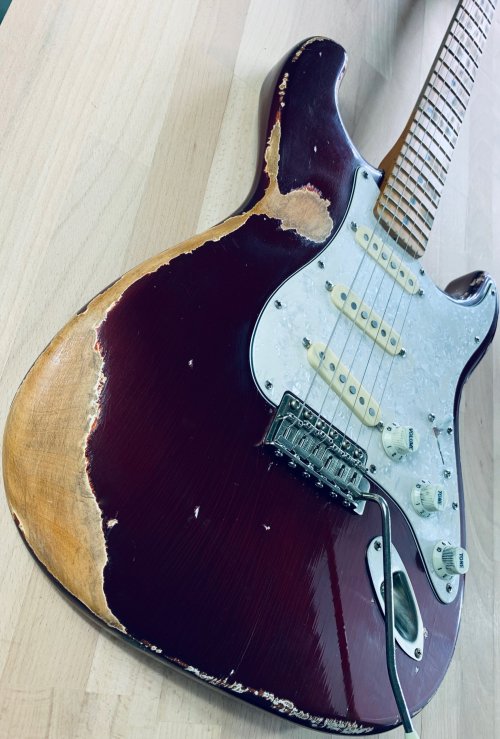 Selected lightweight body custom made by USACG in Washington, in 100% full-nitro Faded Shell Pink and perfectly Aged with lots of checking marks. AllParts made in Houston, USA JB Vintage style neck, Aged in full-nitro. Collins « Jazztone T-196 » Handwound Pickups, handmade in Dallas, Texas. Genuine Alpha pots/Real PIO capa, Sandberg tuners, Fender USA covers and Gotoh Japan hardware.